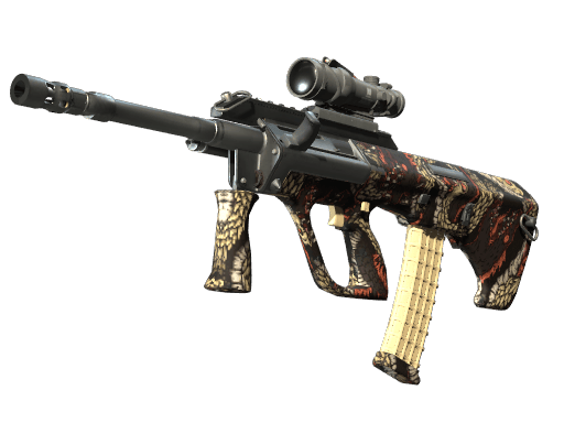 Powerful and accurate, the AUG scoped assault rifle compensates for its long reload times with low spread and a high rate of fire. A custom pattern of snakes and amphibians has been applied.